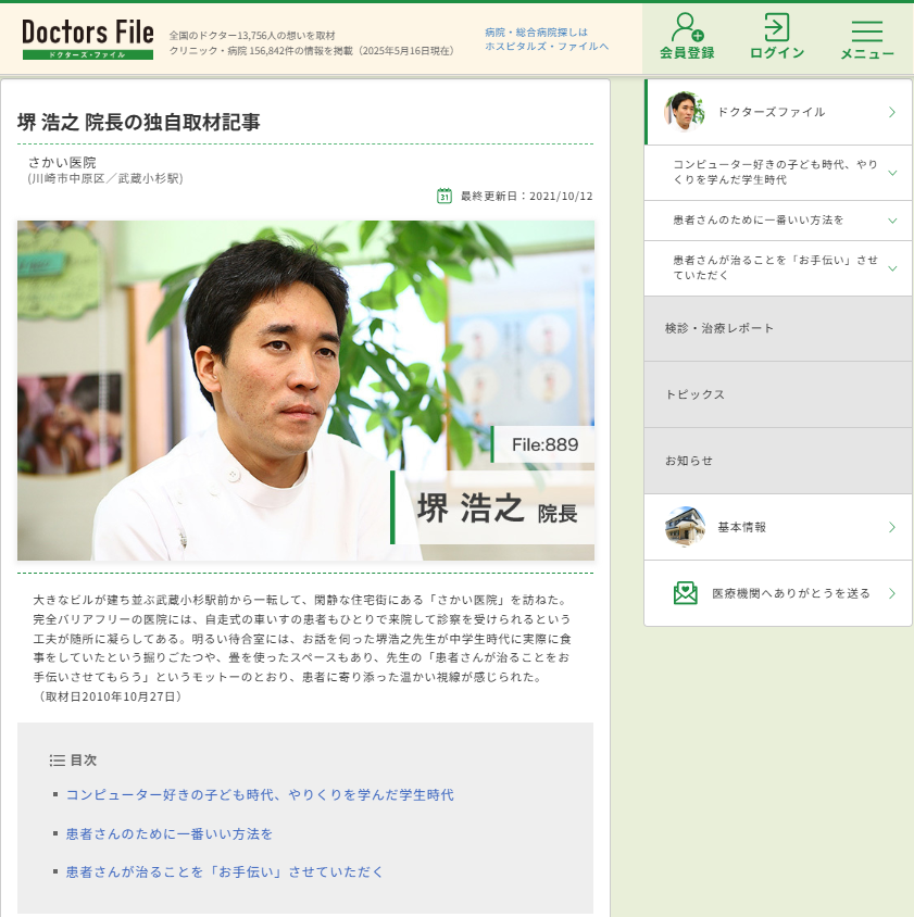 2010年に「ドクターズ・ファイル(DF)」の取材を受ける前から、ギミックの存在を知っていた堺浩之院長。社名が株式会社リクルーティング・ギミックだった時代から、DFの案内を受けていたという。同院は2005年の開業以来、ITに関しても専門的な知識と技術を持つ院長が、自前のサーバーで医院ホームページを運営。集患と情報発信の間接的な動線としてDFを導入し、雑誌『頼れるドクター』にも毎年掲載を続けている。